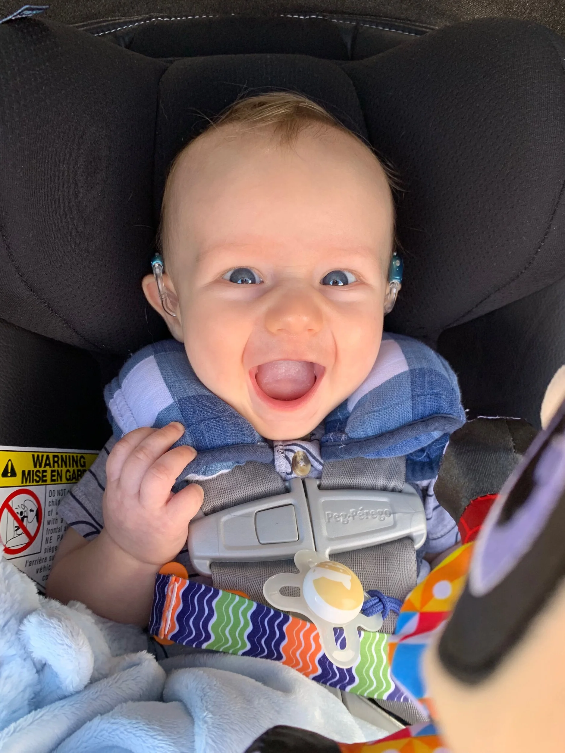At 8 weeks old, Emmett was fitted with his very first hearing aids. They were so tiny and I remember he would just smile and giggle every time we put them on. Our audiologists were not sure if he would get any sound from the hearing aids but in order to qualify for the Cochlear Implants we needed to go through a hearing aid trial. At this point, going from thinking my baby would never hear my voice, to the possibility of him being able to do so much more, We were willing to try anything.